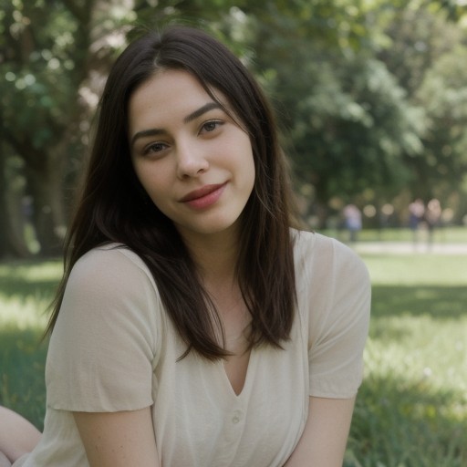 a silly girl is sitting on the grass, in the park lawn, flowers trees nature lush, she smiles and makes a funny face, young lady cute face symmetrical perfect human