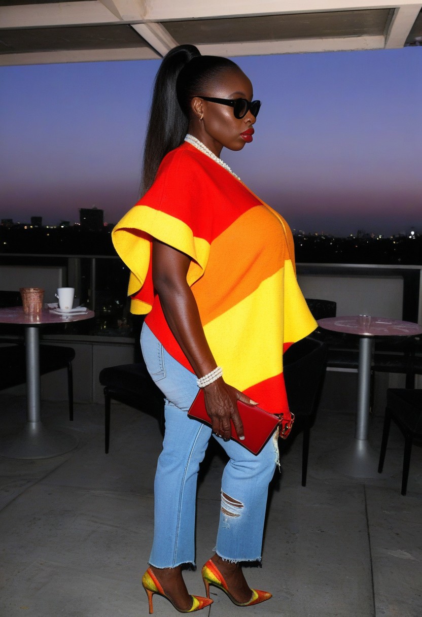 1woman ((dark skinned ( mature african american 90yo WOMAN:1.9) )),, 90yo, (African:2.0) grandmother, (auditioning :2.0 ) ( ponytail:1.5), blond hair, round face, beauty mark, jowly cheeks, large bulbous nose, skin imperfections, dark skin, , big eyes, , bags under eyes, long full eyelashes, light pink lipstick, heavy make-up, wide hips, large butt wearing a chic (yellow orange and red) oversized tube top poncho. Her hairstyle is a (long straight hair) Paired w/ distressed denim jeans, shades, she completes her look with crusted high heel shoes and a matching designer tote bag. The setting is a rooftop cafe. Night , pearl jewelry, (very high heels:1.0),), eyes wide open, , cleavage, making eye contact with viewer, full shot, full view, (((Civil rights era) Environment Style :1.8) ), (low light, direct flash, polaroid sx-70 analog film:2.0), slutty, sleazy (9-inch high stiletto heels) (protruding ass:1.8)