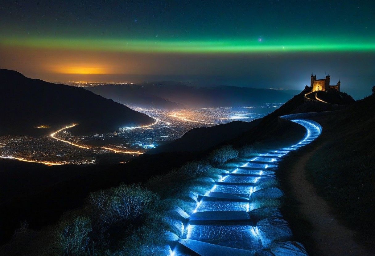 At night in the foreground is an intricate stone path curving downwards down a mountain towards the large coastal city in the background. Green shimmering fireflies sparsely line the path towards the city in the background that is built from white stone, with organic, flowing architecture illuminated by soft silver night light from the high rooftops. Crystals throughout the city emanate a gentle white glow, while heavy shadows darken the streets which are sparsely lit. The night sky is dark with a teal-toned atmosphere (red, orange, white, soft blues), violent solar storm above, arcs of space lightning crackling through the charged atmospheric haze, in the sky: a massive celestial body looms with smaller celestial bodies orbiting it, feeding off the glowing gases of a nearby nebula, tendrils of cosmic gases stretching between them, surreal space sky filled with stars and interstellar dusts suggesting this is an alien world. The streets are empty, adding to the serene, mystical atmosphere. The wonderfully constructed buildings spire in a grandiose show of power. It's part castle part city. (masterpiece, cinematic composition, moody lighting, soft glow, epic fantasy setting, volumetric light, hyper-detailed environment, intricate textures, dramatic shadows, ultra-sharp focus, depth of field, stunning visual aesthetics, highly immersive scene, award-winning fantasy art style).