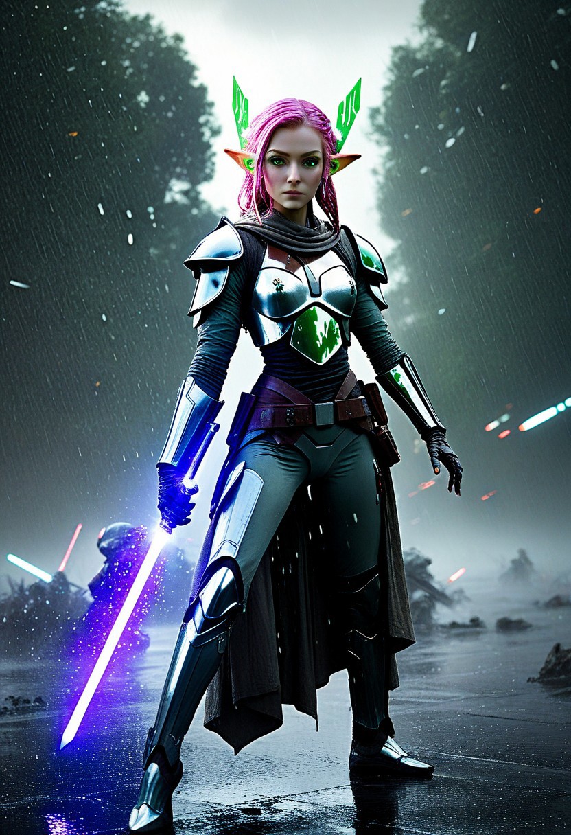 masterpiece, best quality, amazing quality, very aesthetic, DISNEY_ANIMATION, incoth, (incase:0.6), female, solo, (depth of field), outoors, sci-fi, futuristic, raining, battlefield, elf, pink hair, green eyes, cute face, slim, small breasts, long hair swept to one side, beautiful, kawaii, (short ears), serene expression, mandalorian armor, sleek purple lightsaber, standing, dynamic pose, battle stance, looking at viewer, laser shots in the air, battle, explosions,