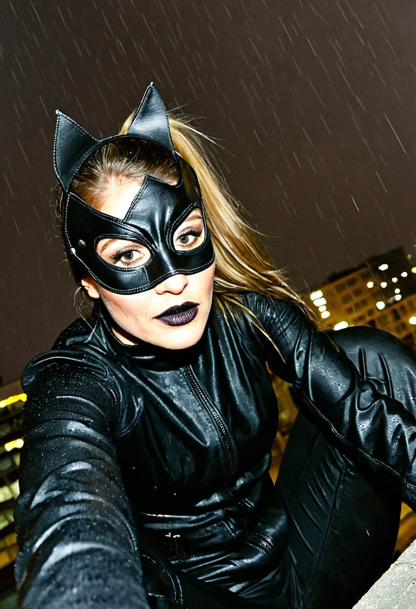 ((wide view)),color picture, (wide medium shot), stunning face, realistic eyes, realistic closed mouth,black lipstick, analog film,amateur photography,candid amateur photo, catwoman mask over eyes, ,old, worn leather pants, old, worn leather long sleeves top,coarse white, visible stitching marks, ((cinematic color)) dangerous girl, intense gaze, sullen face, dynamic composition, girl sitting cross-legged, on top of a building, (rain:1.5)night rain, city night, girl, 23 years old,pretty face, eyeliner,(detailed eyes),dutch angle,view from below,( high ponytail ), long hair,pale skin,(intricate eyes and pupils)