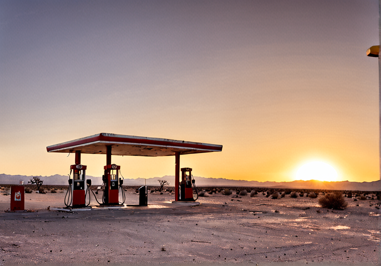 photograph, panorama, desert, abandoned gas station in distance, weathered, old pumps, barren, sunset, Canon RF, Depth of field 100mm, vanishing point, elegant, very coherent, surreal, beautiful composition, excellent composition, beautiful elegant