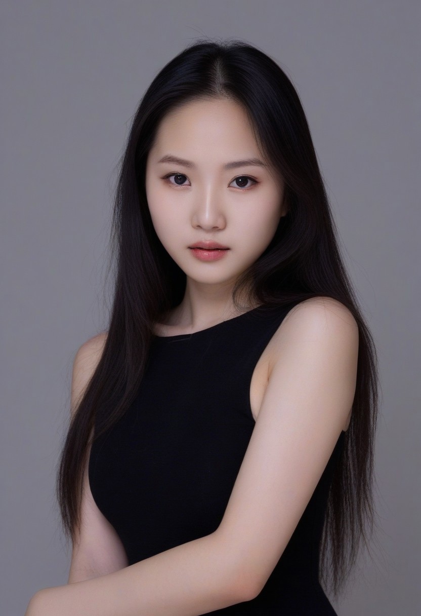 asian girls, Full-body front view, long hair, black dress, she has a perfect oval face, delicate features as if carefully carved. Her oval face is small and exquisite, with clear contours and soft beauty. Her face is white and clear, as if you can see the delicate blood vessels under the skin. Her face is round and delicate, as radiant as a full moon. She has a typical delicate face of an oriental woman, gentle and individual. Face to the camera