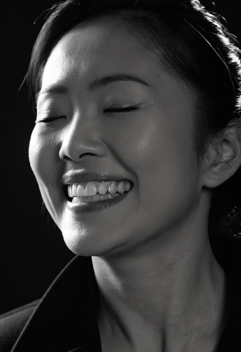 A black and white portrait photograph of a japanese woman in his 30s-40s captured in a moment of pure, uninhibited joy. The woman's eyes are closed in laughter, revealing brilliant white teeth contrasting against his full. Professional studio lighting creates dramatic side illumination that emphasizes facial features and textures. Shot with a medium lens at a close-up frame size with shallow depth of field, the woman wears a dark coat with an upturned collar and is positioned slightly angled against a smoothly gradated dark background. Black and white studio portrait photography with dramatic side lighting and shallow depth of field.