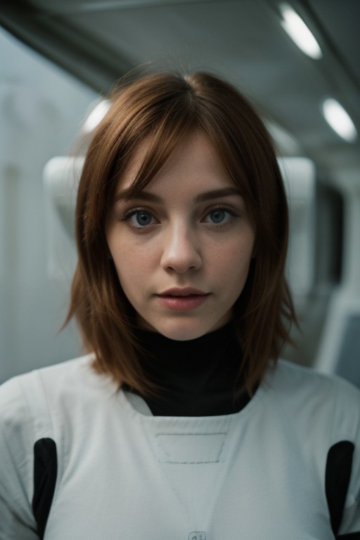 photo of a ginger woman, in space, futuristic space suit, (freckles:0.8) cute face, sci-fi, dystopian, detailed eyes, blue eyes