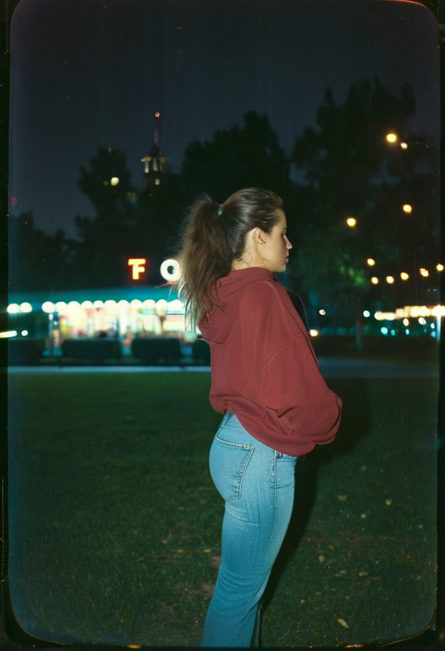 portrait, masterpiece, 4k, ray tracing, intricate details, highly-detailed, hyper-realistic, 8k RAW Editorial Photo. This is a dark and moody, candid, analog film photograph, taken at night, of a woman standing in front of a large park in the city. she's wearing tight american eagle jeans and an oversized dark red hoodie, her hair is in a relaxed ponytail, her figure is casting a shadow style, ((ISO 200 faded film, 35mm photo, grainy, vignette, vintage, Kodachrome, Lomography, stained, highly detailed, found footage cinematic light, dramatic light, shallow depth of field, high budget, bokeh, cinemascope, film grain))