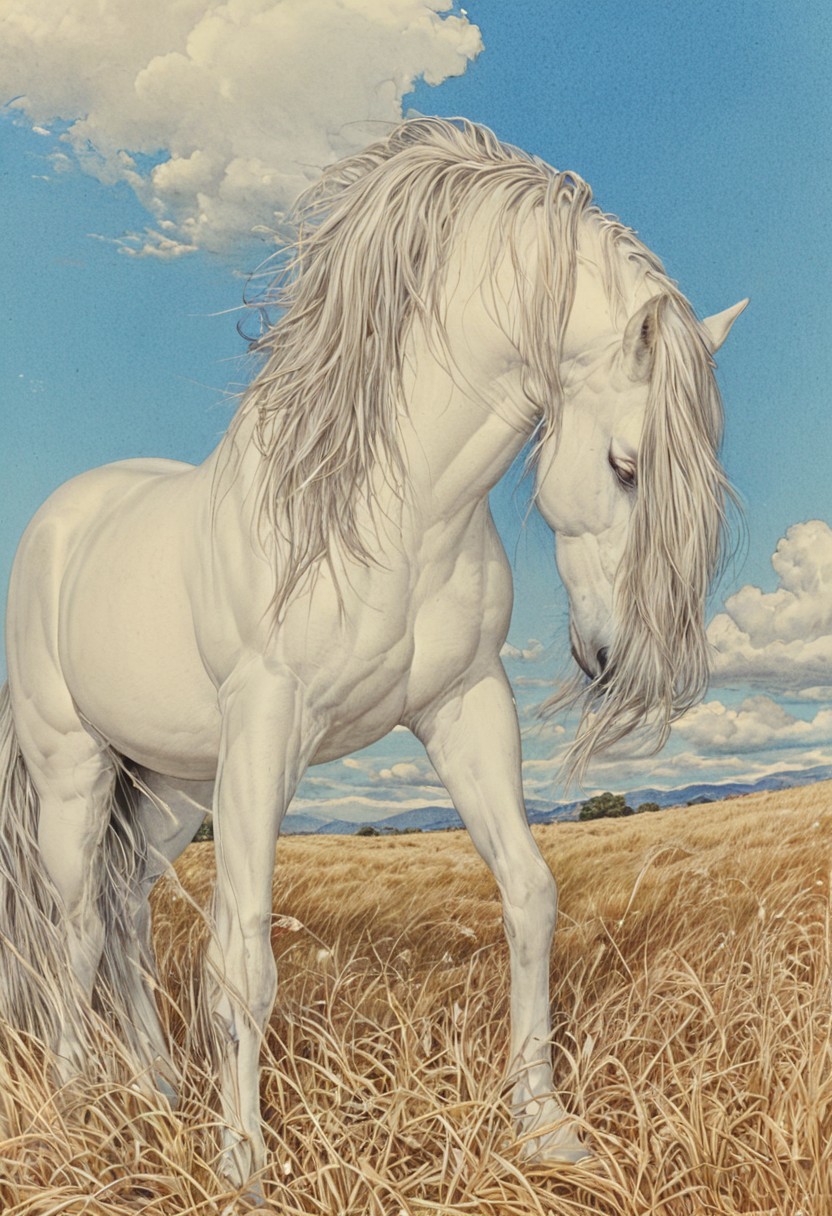 (highly detailed), (hyper realistic), ArsMJStyle, Colored pencil hyperdetailed realism — A detailed drawing of a white horse standing in a calm field. The horse has a muscular build and a flowing mane. Its coat is white, cream, and light gray, with smooth, blended textures. The horse stands with its head turned slightly to the left, showing a calm, regal expression. The field around it is filled with tall, golden grasses that gently sway. The sky above is blue with scattered clouds. The light in the scene is soft, creating a peaceful mood. The colors used are warm yellows, browns for the grass, and cool blues for the sky. The drawing captures every detail, from the horse’s fur to the grass and sky, giving it a realistic and serene feeling.