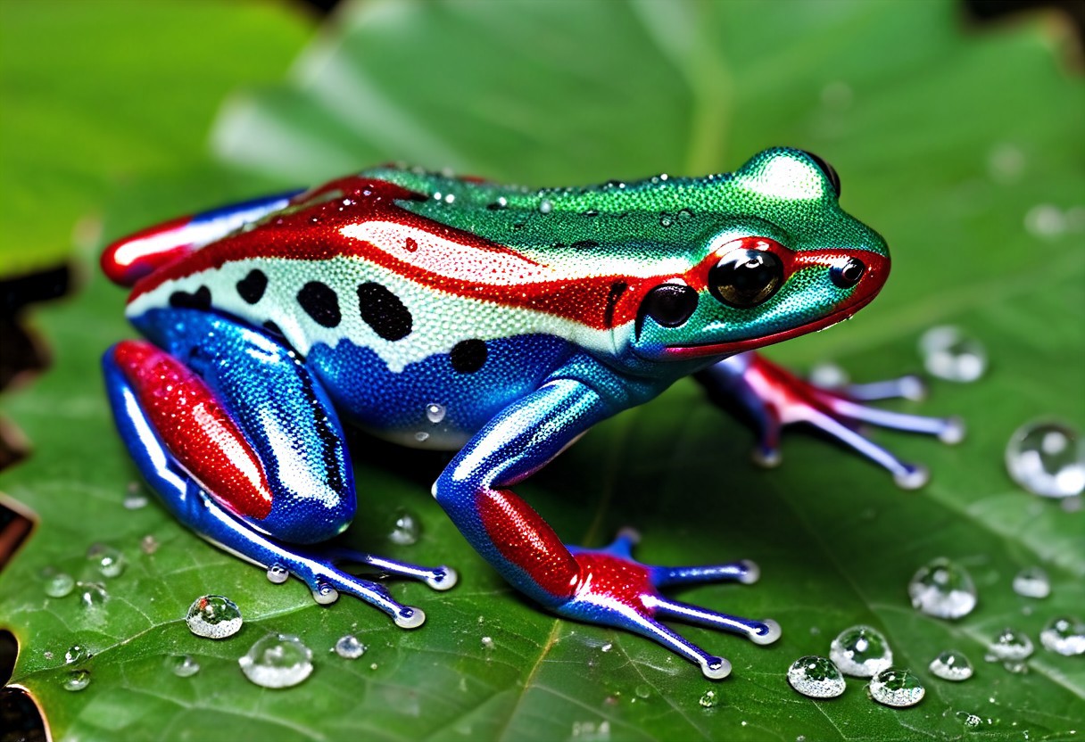 Poison dart frog made of l1qu1dp34rl, metal, pearlescent, green and red, sitting on a leaf with dew on it, macro photography, ultra-high resolution