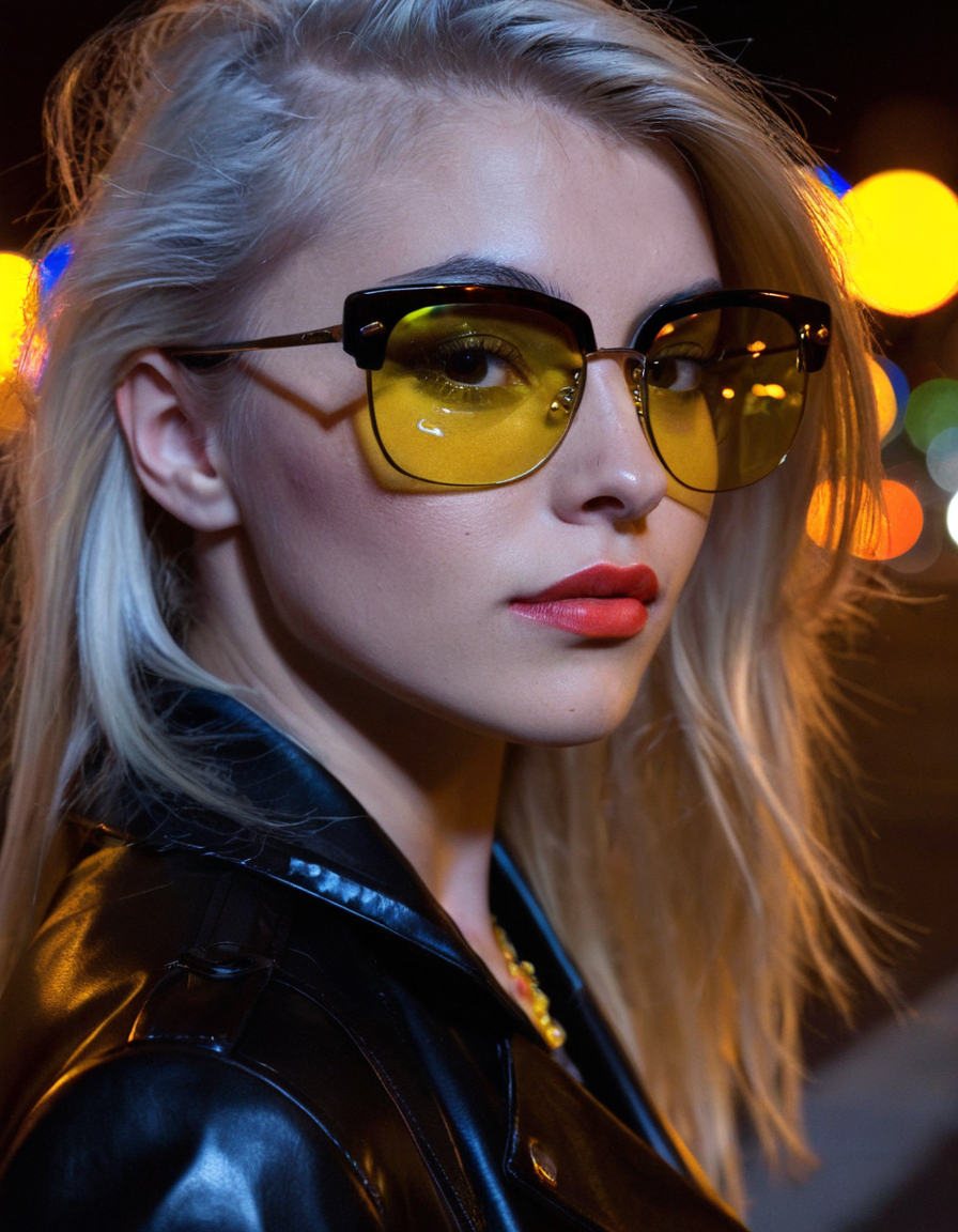 A hyperrealistic photographic portrait capturing a stylish young woman in a vibrant urban night setting. The image is rendered with exceptional sharpness and clarity, particularly on the subject's face and hair, characteristic of a high-quality prime lens (e.g., 50mm f/1.4 or 85mm f/1.8) used with controlled lighting or skillfully capturing ambient city light. The shallow depth of field creates a distinct separation from the blurred, bokeh-rich background, emphasizing her edgy, modern aesthetic. Character & Face (Highly Detailed): Subject: A young woman with a fair complexion. Complexion: Appears smooth and clear, with realistic skin texture visible under close inspection. The dramatic city lighting creates defined highlights on her cheekbones, the bridge of her nose, and chin, contrasted by soft shadows that sculpt her features. The area around her eyes is subtly tinted by the yellow lenses. Eyes: Visible through the transparent yellow lenses of her sunglasses. Her eyes, likely dark (e.g., brown or hazel), follow the turn of her head, looking slightly away from the camera towards the side. Her expression appears neutral or observant, filtered through the yellow tint. Soft catchlights from city lights might be visible within her pupils. Eyebrows: Well-defined, dark eyebrows are visible above the frame of the sunglasses, showing fine hair texture. Nose: The shape is clearly visible, well-proportioned. Cheeks & Jawline: A sharp, defined jawline is evident, contributing to a confident and slightly edgy look. Cheekbones are highlighted by the ambient lighting. Lips: Full lips painted in a vibrant, bright red lipstick with a noticeable satin or subtle gloss finish. They are slightly parted, conveying a neutral or subtly confident expression. Hair: Short, layered hair styled in a voluminous, slightly messy or windblown fashion, suggesting movement. The hair features dramatic, professionally dyed multi-tonal colors: roots and top layers appear platinum blonde or white, transitioning into vivid pink and purple/lavender hues in the mid-lengths and ends. Realistic hair texture is visible, with individual strands catching reflections from the surrounding city lights (particularly strong yellow/orange highlights). Expression & Pose: She holds a cool, confident expression. With her eyes now visible, the expression feels more direct and observable, though still maintaining an air of urban chic. Her head is turned slightly to the side, looking away from the camera, captured as if in mid-motion or glancing aside, adding a dynamic quality to the portrait. Attire & Accessories: Attire: Jacket: A dark, likely black leather or high-quality faux leather jacket, possibly a biker style, with a collar slightly turned up. The texture shows a realistic sheen, catching subtle highlights from the city lights. Top: A simple white cotton top is visible beneath the open jacket, possibly with faint horizontal reddish stripes barely discernible. Accessories: Sunglasses: Large, oversized sunglasses with thick, glossy black acetate frames. The lenses are clear, transparent yellow, allowing her eyes to be seen distinctly. Subtle surface reflections might still be present but do not obscure the view of her eyes. Necklace: A sleek, simple silver or white gold choker necklace rests against her collarbone. Bag: The strap of a shoulder bag (material indistinct) is visible slung over her right shoulder. Background & Composition: Background: A heavily blurred urban night scene. Abstract shapes of out-of-focus city lights (creating significant bokeh), building structures, and possibly light trails are visible, rendered in a palette of warm oranges, yellows, and deep blues/purples. Composition: A medium close-up shot focusing on the head, shoulders, and upper torso. Vertical orientation. Strong subject isolation due to the very shallow depth of field. High contrast lighting enhances the dramatic mood. Camera & Lens Details: Captured using a high-resolution full-frame camera and a sharp prime lens with a very wide aperture (e.g., f/1.4 or f/1.2) to achieve the critical sharpness on the subject and the extreme background blur (bokeh). Focus is critically sharp on the eyes (visible through the lenses), lips, and foreground hair strands. Extremely shallow depth of field isolates the subject dramatically. Lighting & Camera Quality: Dramatic urban night lighting, characterized by multiple, colorful artificial light sources (streetlights, neon signs, vehicle lights). This creates strong highlights, deep shadows, and distinct rim lighting (especially the yellow/orange light catching her hair and shoulder). Light passes through the yellow lenses to illuminate her eyes. Image quality is exceptionally high, showcasing extremely sharp details where focused (eyes, hair strands, lipstick texture, sunglass frame), realistic textures, and smooth tonal gradations despite the high contrast. The overall look is polished, vibrant, and cinematic.
