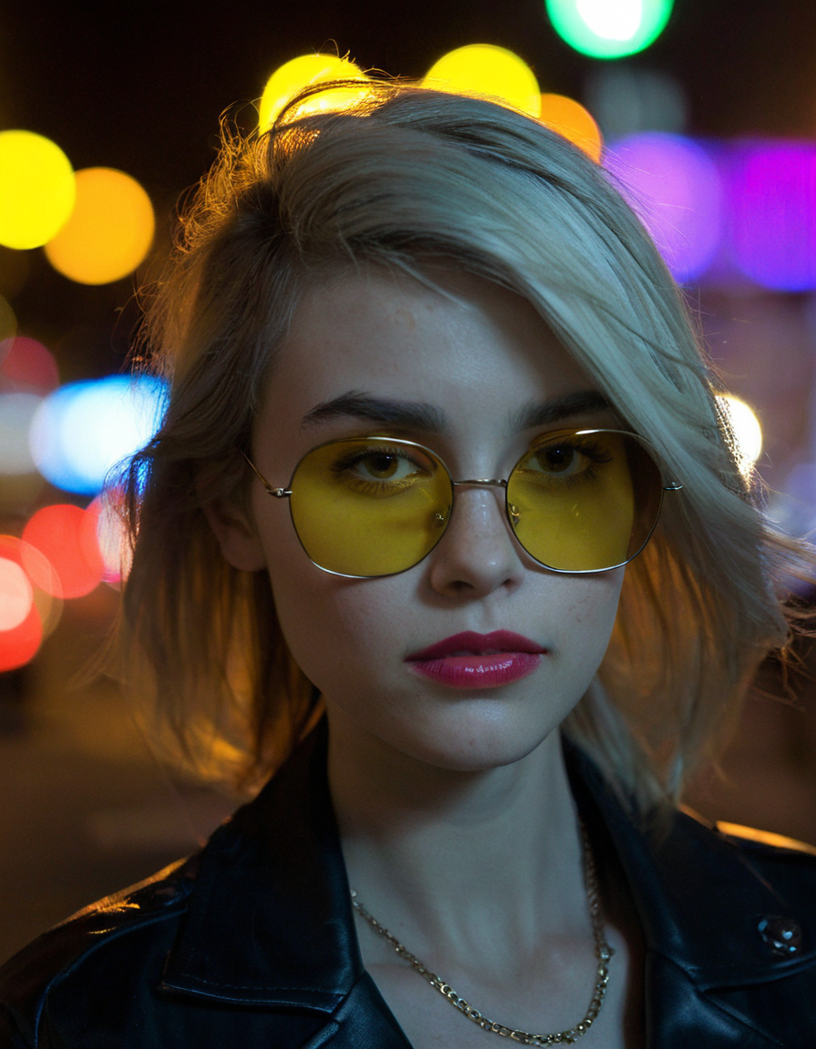 A hyperrealistic photographic portrait capturing a stylish young woman in a vibrant urban night setting. The image is rendered with exceptional sharpness and clarity, particularly on the subject's face and hair, characteristic of a high-quality prime lens (e.g., 50mm f/1.4 or 85mm f/1.8) used with controlled lighting or skillfully capturing ambient city light. The shallow depth of field creates a distinct separation from the blurred, bokeh-rich background, emphasizing her edgy, modern aesthetic. Character & Face (Highly Detailed): Subject: A young woman with a fair complexion. Complexion: Appears smooth and clear, with realistic skin texture visible under close inspection. The dramatic city lighting creates defined highlights on her cheekbones, the bridge of her nose, and chin, contrasted by soft shadows that sculpt her features. The area around her eyes is subtly tinted by the yellow lenses. Eyes: Visible through the transparent yellow lenses of her sunglasses. Her eyes, likely dark (e.g., brown or hazel), follow the turn of her head, looking slightly away from the camera towards the side. Her expression appears neutral or observant, filtered through the yellow tint. Soft catchlights from city lights might be visible within her pupils. Eyebrows: Well-defined, dark eyebrows are visible above the frame of the sunglasses, showing fine hair texture. Nose: The shape is clearly visible, well-proportioned. Cheeks & Jawline: A sharp, defined jawline is evident, contributing to a confident and slightly edgy look. Cheekbones are highlighted by the ambient lighting. Lips: Full lips painted in a vibrant, bright red lipstick with a noticeable satin or subtle gloss finish. They are slightly parted, conveying a neutral or subtly confident expression. Hair: Short, layered hair styled in a voluminous, slightly messy or windblown fashion, suggesting movement. The hair features dramatic, professionally dyed multi-tonal colors: roots and top layers appear platinum blonde or white, transitioning into vivid pink and purple/lavender hues in the mid-lengths and ends. Realistic hair texture is visible, with individual strands catching reflections from the surrounding city lights (particularly strong yellow/orange highlights). Expression & Pose: She holds a cool, confident expression. With her eyes now visible, the expression feels more direct and observable, though still maintaining an air of urban chic. Her head is turned slightly to the side, looking away from the camera, captured as if in mid-motion or glancing aside, adding a dynamic quality to the portrait. Attire & Accessories: Attire: Jacket: A dark, likely black leather or high-quality faux leather jacket, possibly a biker style, with a collar slightly turned up. The texture shows a realistic sheen, catching subtle highlights from the city lights. Top: A simple white cotton top is visible beneath the open jacket, possibly with faint horizontal reddish stripes barely discernible. Accessories: Sunglasses: Large, oversized sunglasses with thick, glossy black acetate frames. The lenses are clear, transparent yellow, allowing her eyes to be seen distinctly. Subtle surface reflections might still be present but do not obscure the view of her eyes. Necklace: A sleek, simple silver or white gold choker necklace rests against her collarbone. Bag: The strap of a shoulder bag (material indistinct) is visible slung over her right shoulder. Background & Composition: Background: A heavily blurred urban night scene. Abstract shapes of out-of-focus city lights (creating significant bokeh), building structures, and possibly light trails are visible, rendered in a palette of warm oranges, yellows, and deep blues/purples. Composition: A medium close-up shot focusing on the head, shoulders, and upper torso. Vertical orientation. Strong subject isolation due to the very shallow depth of field. High contrast lighting enhances the dramatic mood. Camera & Lens Details: Captured using a high-resolution full-frame camera and a sharp prime lens with a very wide aperture (e.g., f/1.4 or f/1.2) to achieve the critical sharpness on the subject and the extreme background blur (bokeh). Focus is critically sharp on the eyes (visible through the lenses), lips, and foreground hair strands. Extremely shallow depth of field isolates the subject dramatically. Lighting & Camera Quality: Dramatic urban night lighting, characterized by multiple, colorful artificial light sources (streetlights, neon signs, vehicle lights). This creates strong highlights, deep shadows, and distinct rim lighting (especially the yellow/orange light catching her hair and shoulder). Light passes through the yellow lenses to illuminate her eyes. Image quality is exceptionally high, showcasing extremely sharp details where focused (eyes, hair strands, lipstick texture, sunglass frame), realistic textures, and smooth tonal gradations despite the high contrast. The overall look is polished, vibrant, and cinematic.